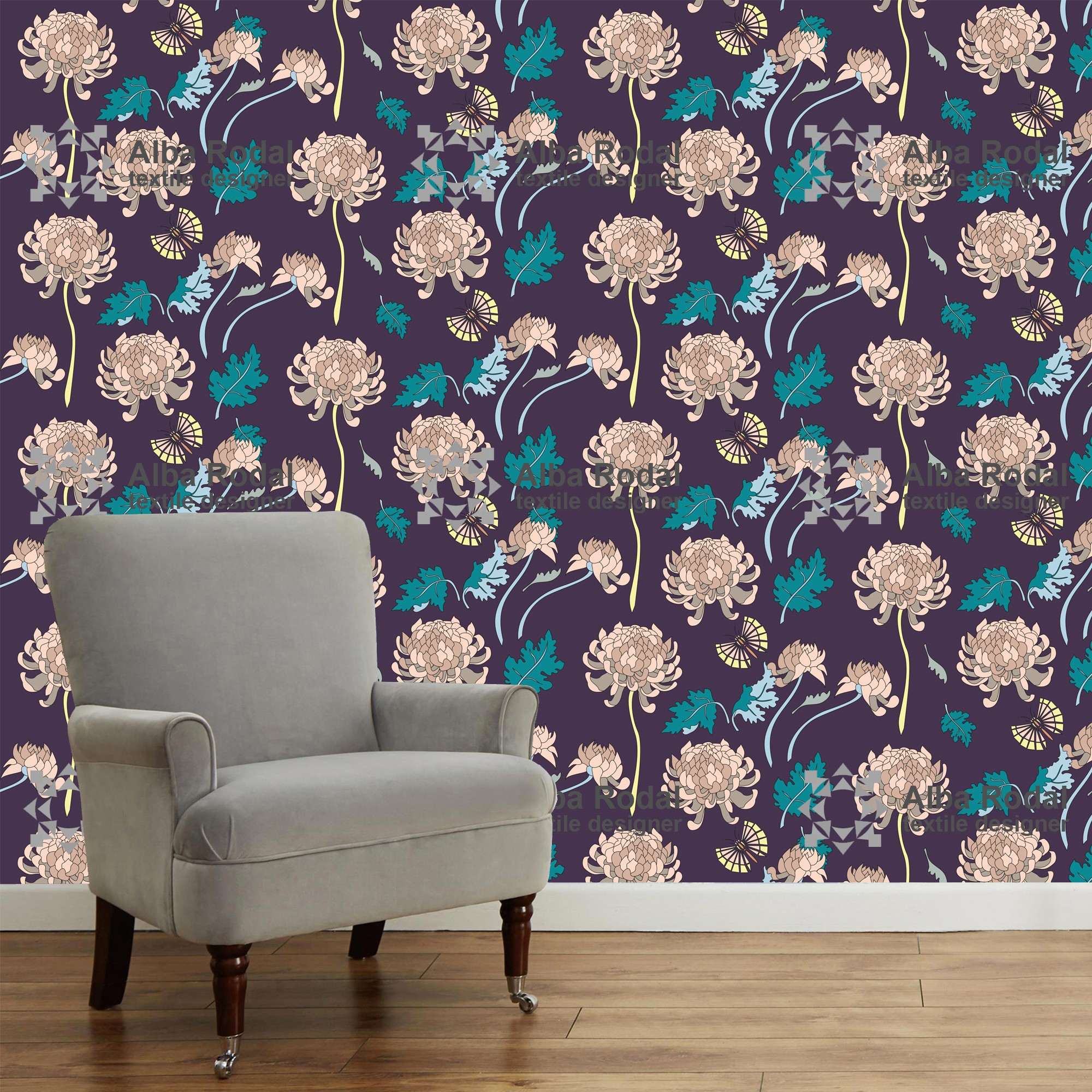 Beautiful composition of chrysanthemums and butterflies on a purple background.